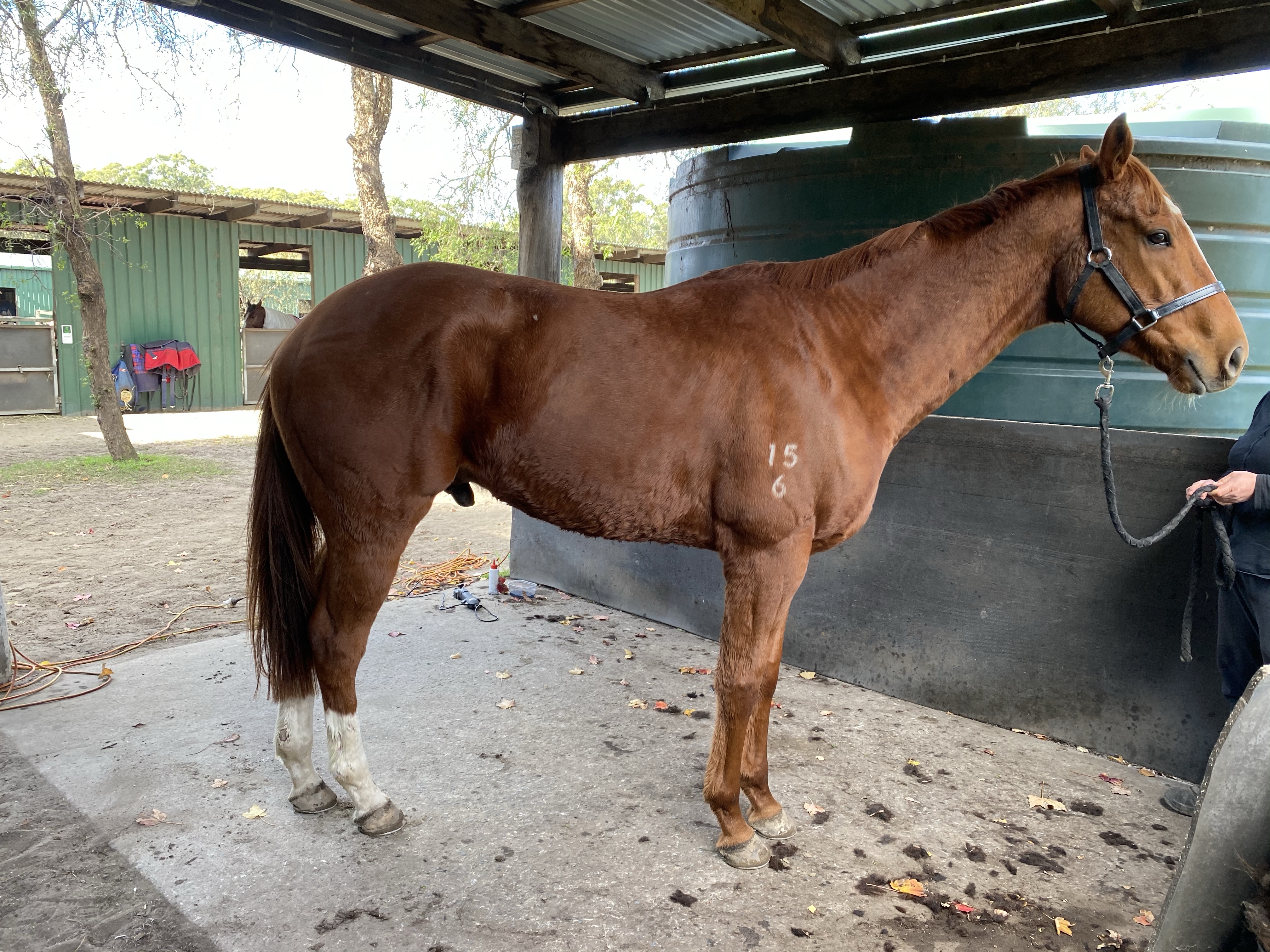 Pahang is building up his fitness well and is ready to start 1/2 pace next week. His Winter coat was getting very thick and causing some skin problems on his socks so we have clipped him and his skin is clearing up straight away. A before and after photo are below. He is eating very well and has gone up a rug size since last prep.